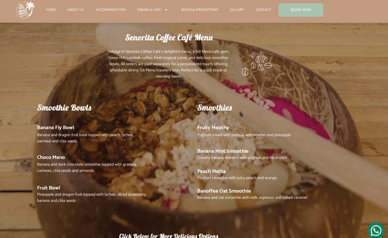 Tucked away on Gili Meno’s gorgeous east coast, just a short 500-meter stroll from the harbor, Meno Mojo Beach Resort feels like your own little slice of paradise. It’s a cozy, budget-friendly spot that welcomes families, solo adventurers, and groups with open arms. Picture yourself in one of seven beachfront rooms with private terraces, ten oceanview rooms with balconies, or a roomy two-bedroom Lumbung villa, each with ocean views, comfy double beds, and handy perks like air conditioning and free WiFi. Step outside to free sunbeds, a quick beach shower, and amazing turtle snorkeling right at your doorstep. Grab a tasty seafood BBQ at the waterfront restaurant or a delicious Lombok coffee with a view at Senorita Coffee Café. With its laid-back island vibe and super-friendly staff, Meno Mojo is all about relaxation and fun. It's Gili Meno’s hidden gem!
